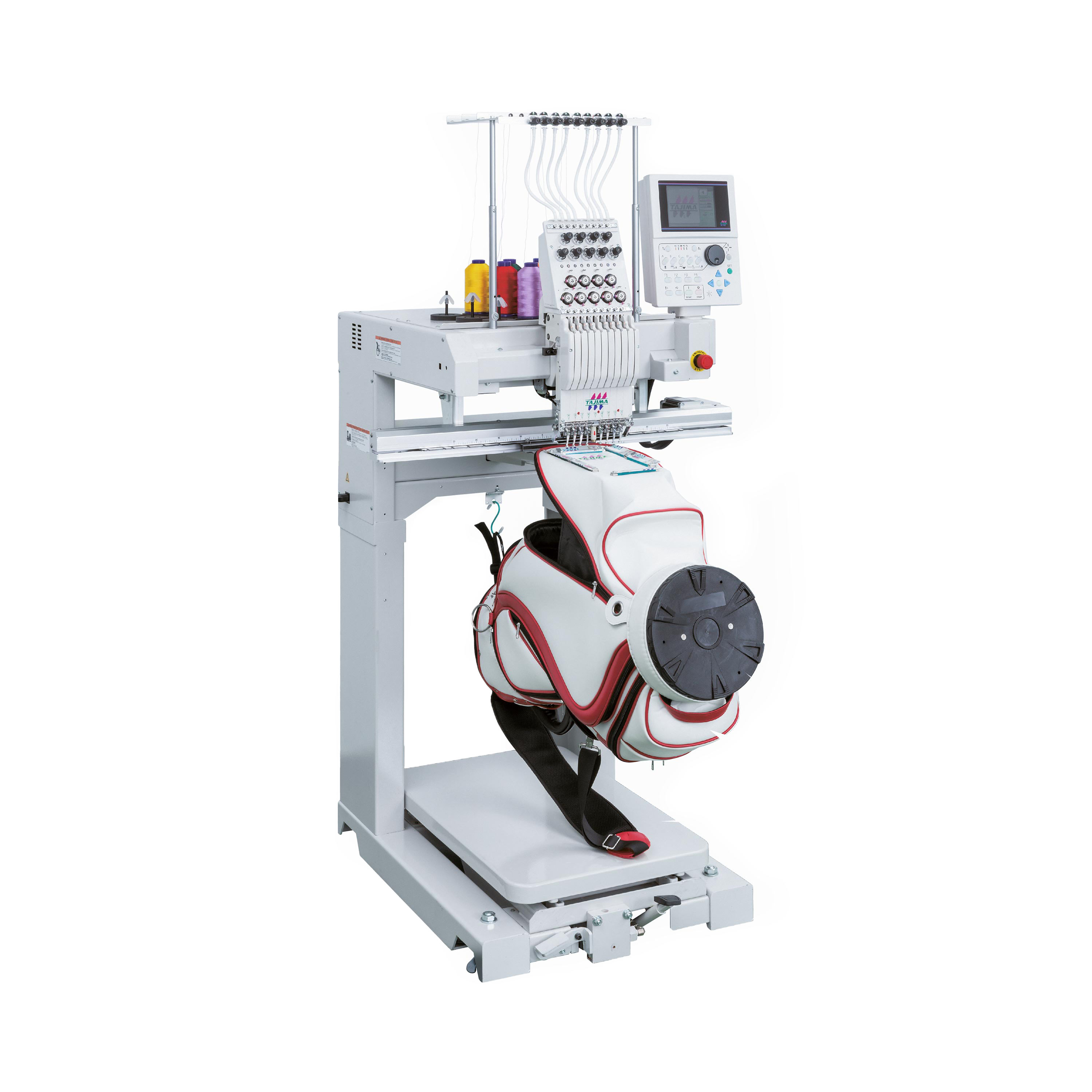 Il modello TMBU Tajima rappresenta una soluzione ideale per il ricamo su borse, giacche o sacche da golf di grandi dimensioni, grazie ad un tavolo di lavoro regolabile tramite un pedale.